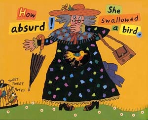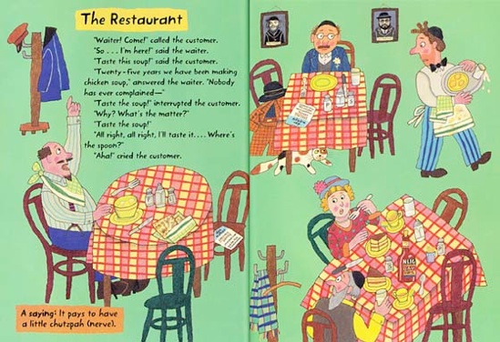 Kibitzers and Fools: Tales My Zayda Told Me is another explicitly Jewish book. It features old Eastern European jokes, folktales, and Chelm stories interspersed with Tabackâs trademark googly-eyed citizenry, jam-packed layouts and excellent chickens. (No one draws a chicken like Taback.) Itâs dedicated to Sholom Aleichem, I.L. Peretz, and Mendele Mocher Sâforim. Though most of Tabackâs books are like Levyâs Jewish Ryeâyou donât have to be Jewish to love them, but it wouldnât hurtâthis one might not resonate with your average Episcopalian second-grader. The specific rhythms and shruggy, rueful, ânuâ tone are a definite âhamavin yavinâ situation.