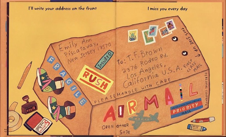 "I'm going to jump inside a nice big box," she declares, "I don't care what you say/ I'll write your address on the front/ I miss you every day./ Please take me to the post office/ They will sort me on my way/ I'll jump into a mailbag/ I miss you every day."